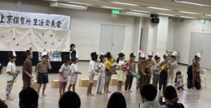 色々な思いを胸に迎えた生活発表会当日。そんな中で、こんな事出来るようになったんだよ!と日頃から楽しんでいるリズム遊びや歌を歌ったり、保育所での経験や大好きな絵本などをテーマにした劇を、おうちの方の前で披露してくれました。
